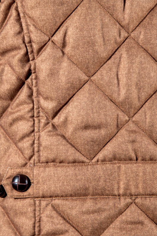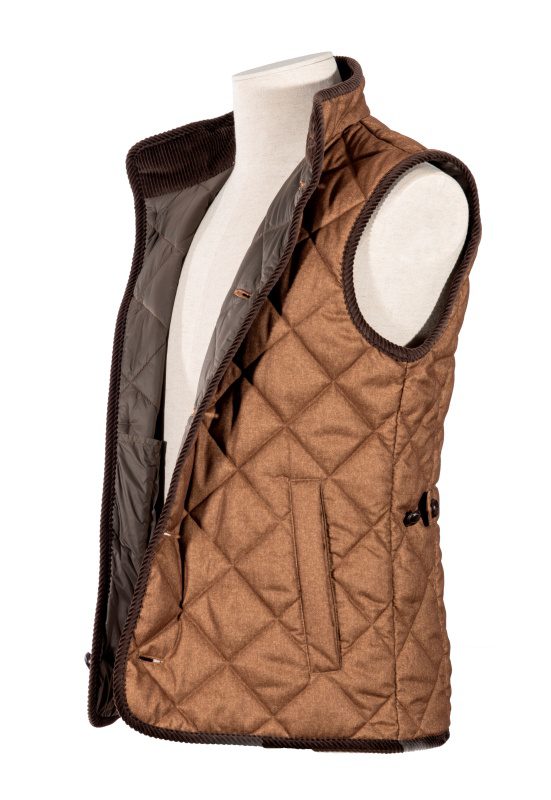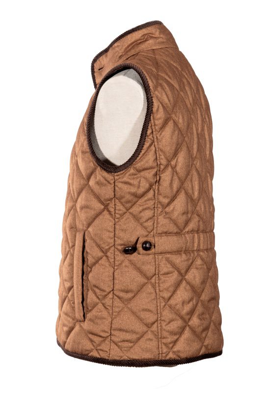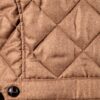 Notre gilet est doté d’un haut col montant couvrant de 6,5 cm, idéal pour la protection contre le froid, élégamment doublé d’un velours marron foncé/chocolat pour un confort accru. Ce même passepoil en velours marron est utilisé pour souligner toutes les bordures ajoutant ainsi un raffinement texturé. La fermeture est assurée par des boutons en cuir foncé, contrastant superbement avec le tissu principal et soulignant le caractère haut de gamme de la pièce.