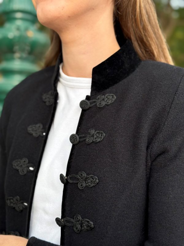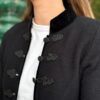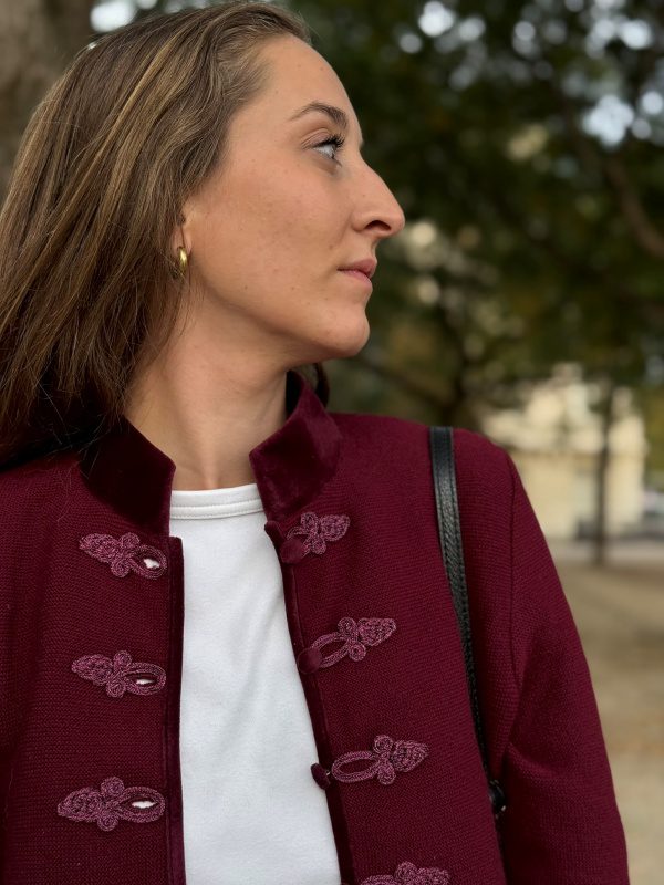Un cardigan autrichien dont le large col officier ainsi que le rabat de ses 2 poches et les rebords, son ouverture et sa manche, sont de velours, ses boutons et ses brandebourgs en passementerie (soie), ton sur ton.