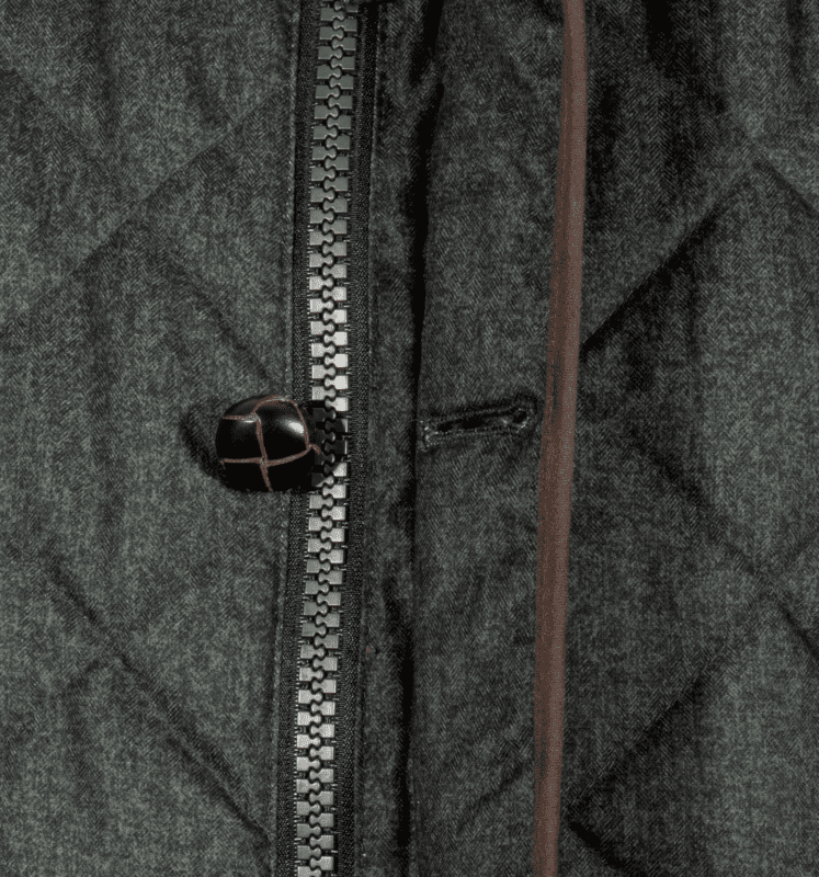 - Passepoil / Biais : L’ensemble de la veste est élégamment souligné par un passepoil (ou biais) de couleur marron, rappelant les boutons en cuir.