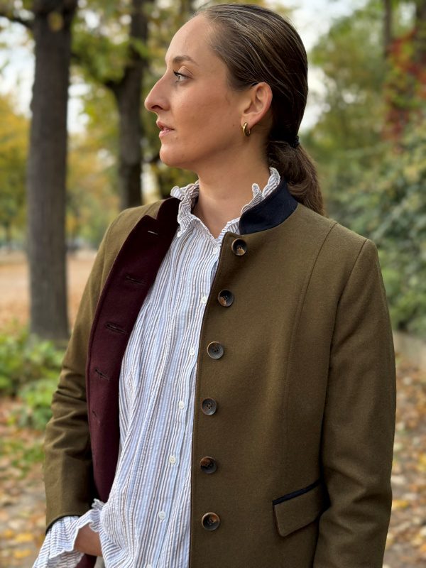 marine doublé prune, on retrouvera ce jeu de couleurs dans tous les petits détails de la veste. Le dos est souligné par un passepoil marine jusqu’à la fente en son bas de 7cm. Possibilité d’un